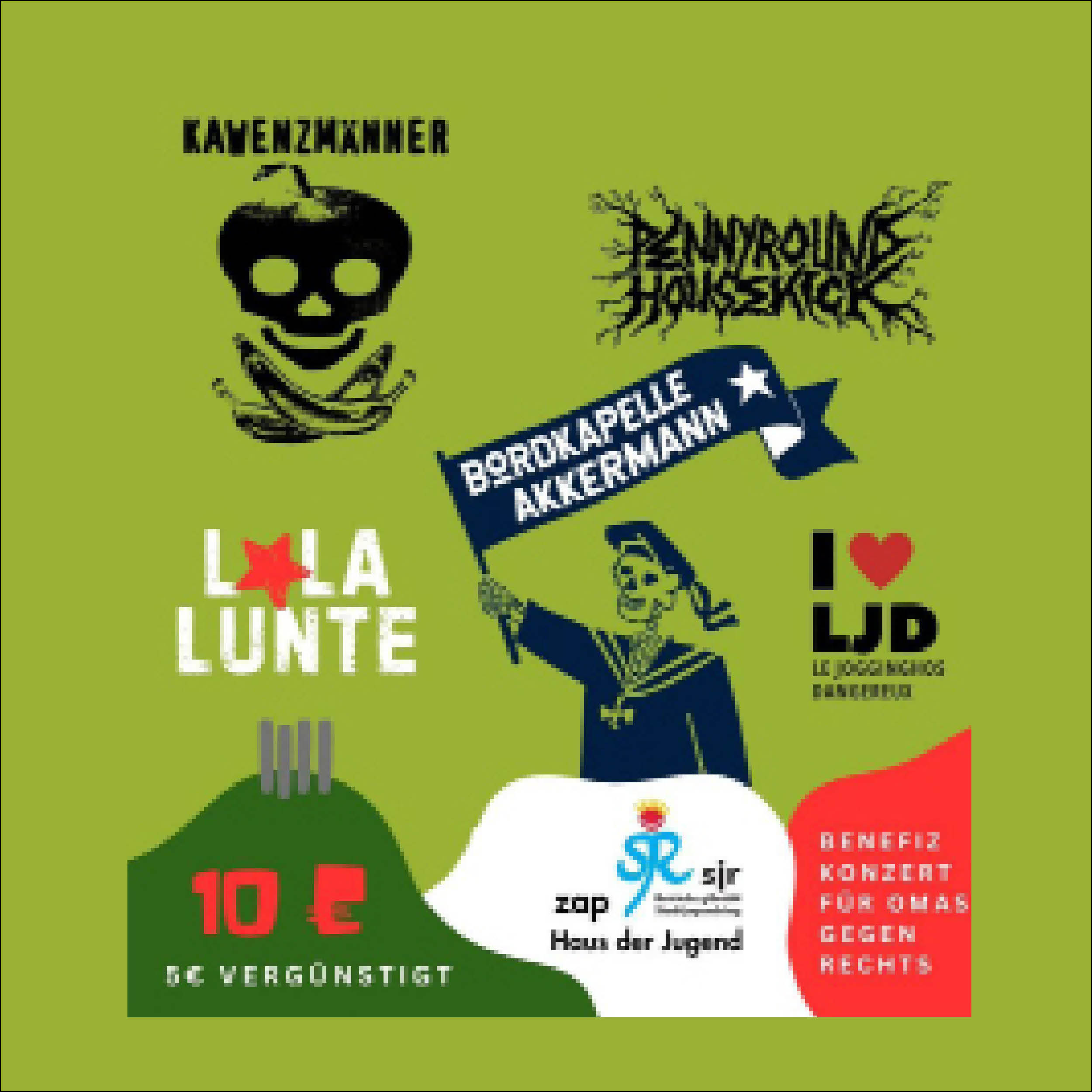 Wir fahren gemeinsam ins Haus der Jugend zum Benefizkonzert SOUNDS OF FREEDOM für die Omas gegen Rechts mit den Bands Bordkapelle Akkermann, Kawenzmänner, Le Jogginghos Dangereux, Lola Lunte und Pennyround Housekick.